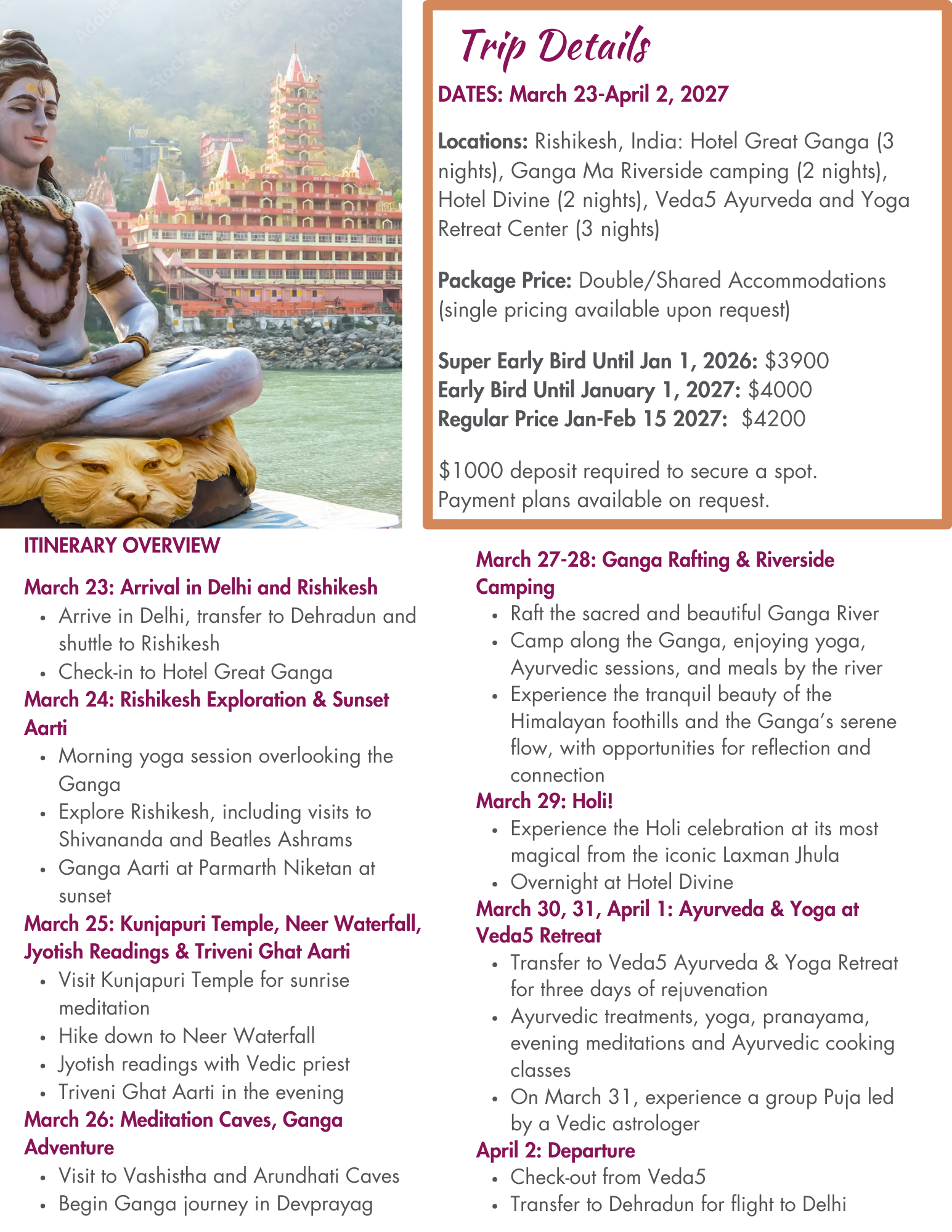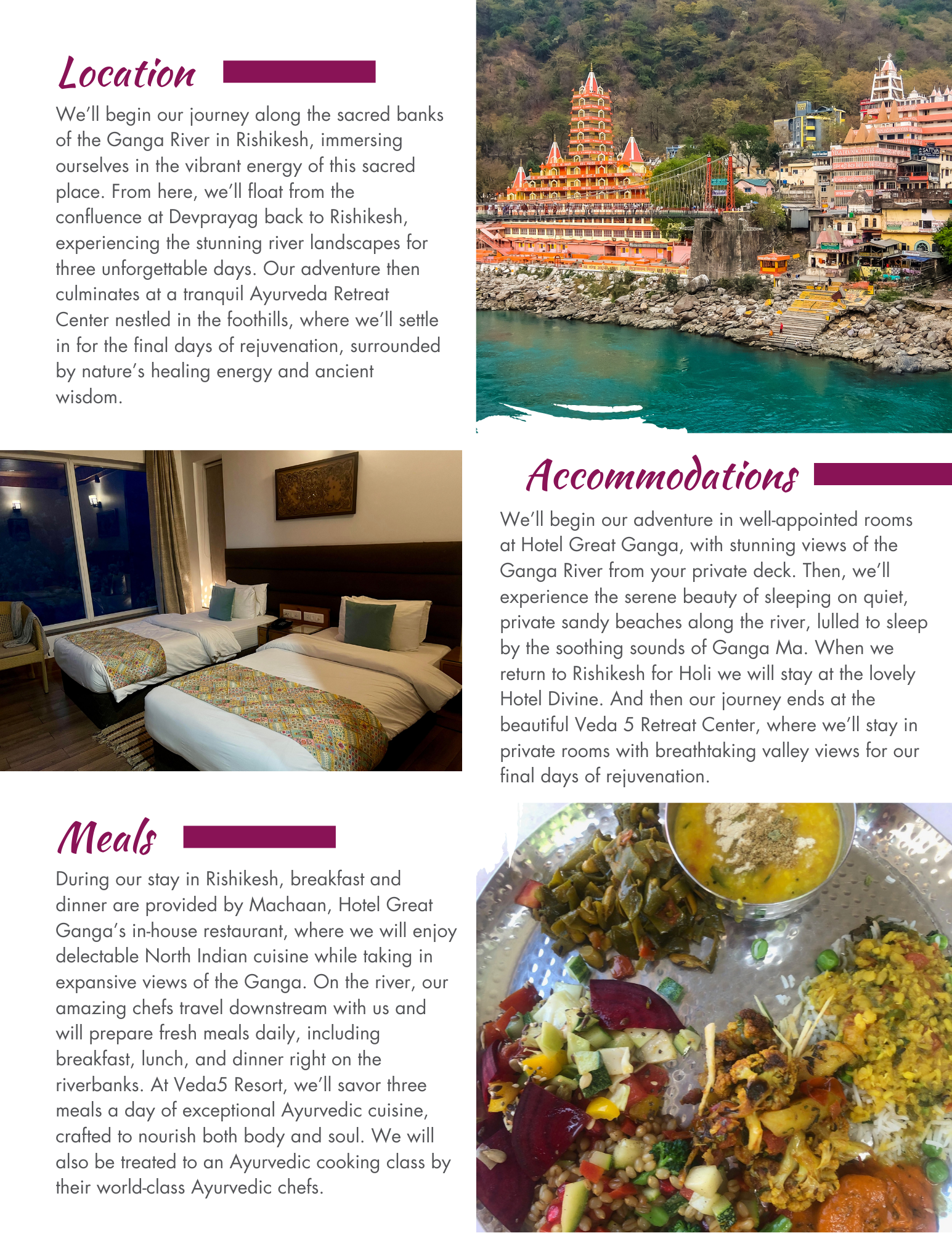 Highlights include sacred water ceremonies and riverside meditations, rafting adventures, Ayurvedic rejuvenation and Chakra Activation yoga. Whether you seek solace, inspiration, or renewal, this journey promises to connect you deeply with the eternal flow of the great river within, as well as in the natural world.